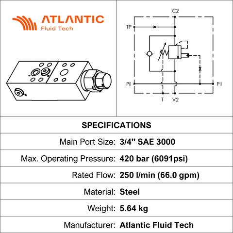THIS CHECK & METERING / OVERCENTRE SINGLE ACTING FULLY COMPENSATED FEATURES G 3/4" × 2 AND G 1/4" × 2 CONNECTIONS WITH A PRESSURE RATING OF 420 BAR AND A FLOW CAPACITY OF 250 LPM. BRAND AFT.