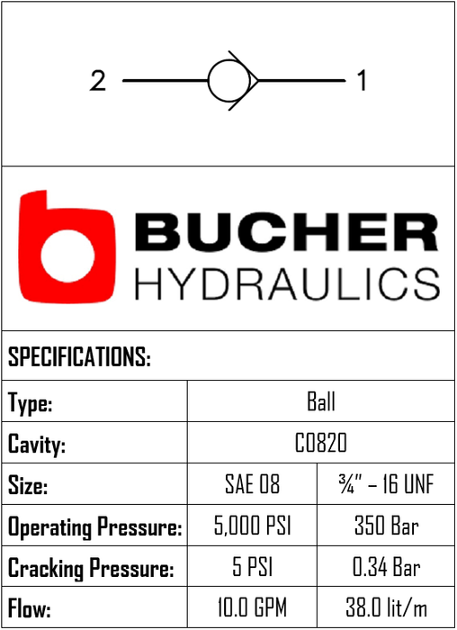 This item is a check valve forward guided ball featuring a 0.34 bar cracking pressure, designed for C-8-2 cavities and rated to 350 BAR. It supports flows up to 38 LPM and is manufactured by BUCHER.