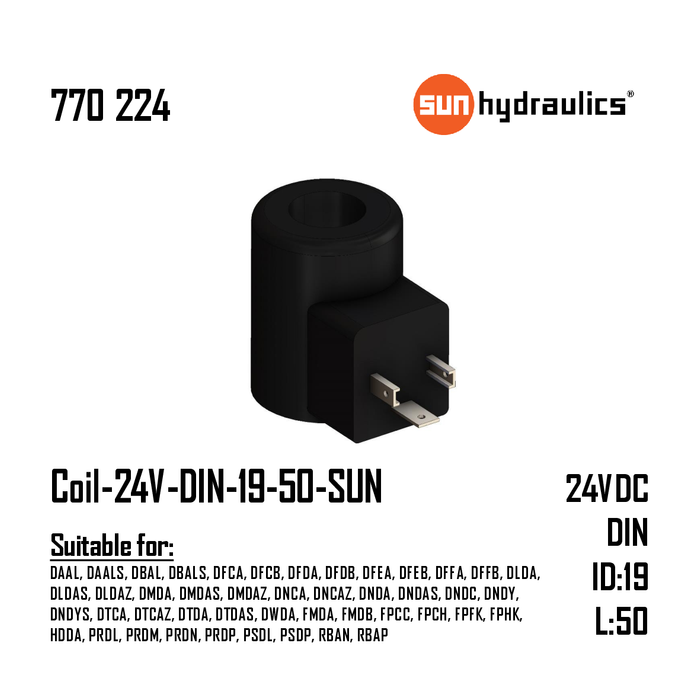 THIS COIL OPERATES AT 24 V AND USES A DIN CONNECTION WITH AN INSIDE DIAMETER OF 19 MM AND AN OVERALL LENGTH OF 50 MM. BRAND: SUN.
