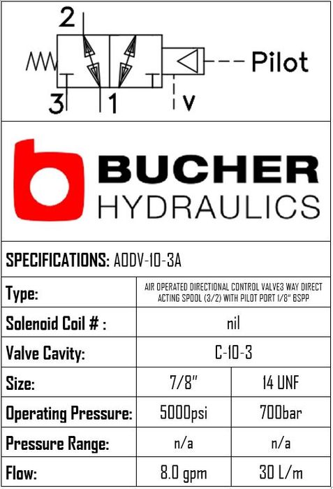 THIS AIR OPERATED PILOT DIRECTIONAL CONTROL VALVE IS A 3-WAY (3/2) SPOOL A TYPE USING A C-10-3 CAVITY, OPERATES TO 350 BAR, AND FLOWS 30 LPM. BRAND: BUCHER HYDRAULICS.