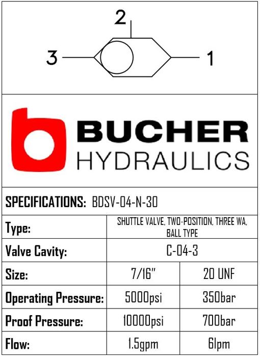 BDSV-04-N-30 • SHUTTLE VALVE TWO-POSITION THREE-WAY BALL TYPE • C-4-3 • 350 BAR • 6 LPM • BUCHER