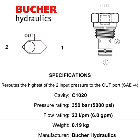 BDSV-10-N-20-4T • SHUTTLE VALVE TWO-POSITION TWO-WAY BALL TYPE • C-10-2 • 350 BAR • 23 LPM • BUCHER