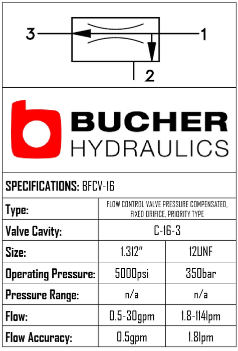 THIS PRESSURE-COMPENSATED FIXED ORIFICE PRIORITY FLOW CONTROL VALVE USES A C-16-3 CAVITY, OPERATES TO 350 BAR, AND HANDLES 114 LPM (1.8–114 LPM). BRAND: BUCHER HYDRAULICS.