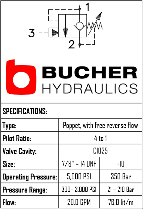 This counterbalance valve is designed for load-holding applications with a 4:1 pilot ratio. It features a C-10-25 cavity, an operating pressure up to 350 bar (set range 21–210 bar), and a flow capacity of 76 LPM. Brand: Bucher Hydraulics.