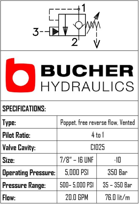This counterbalance valve is designed for load-holding applications with a 10:1 pilot ratio. It features a C-10-25 cavity, an operating pressure up to 350 bar (set range 35–350 bar), and a flow capacity of 76 LPM. Brand: Bucher Hydraulics.