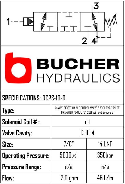 THIS PILOT OPERATED 3-WAY SPOOL D TYPE VALVE USES A C-10-4 CAVITY, OPERATES TO 350 BAR, AND FLOWS 46 LPM. BRAND: BUCHER HYDRAULICS.