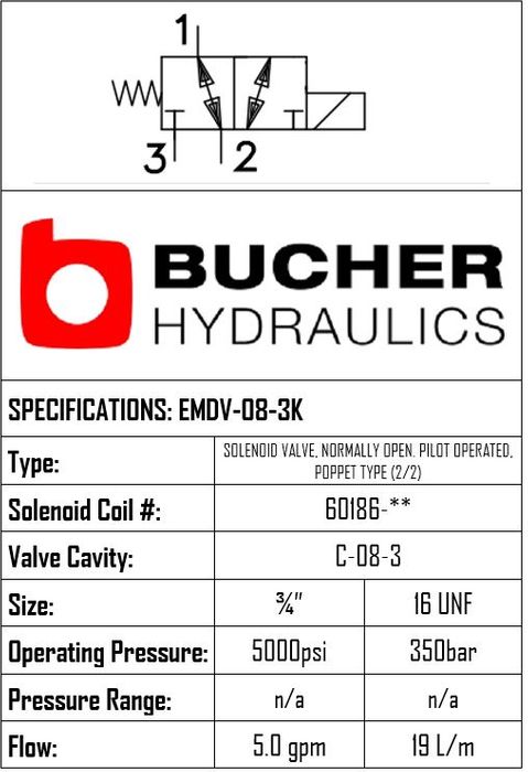 THIS THREE-WAY, TWO-POSITION SPOOL TYPE SOLENOID SOLENOID VALVE FEATURES A C-8-3 CAVITY, OPERATES UP TO 350 BAR, AND HANDLES A FLOW CAPACITY OF 19 LPM. WHEN SOLENOID COIL IS DE-ENERGIZED, THIS VALVE ALLOWS FLOW BETWEEN PORTS 1 AND 2 AND PORT 3 IS BLOCKED. WHEN SOLENOID COIL IS ENERGIZED, THE SPOOL IN THIS VALVE IS SHIFTED AND ALLOWS FLOW BETWEEN PORTS 1 AND 3 AND PORT 2 IS BLOCKED. THIS VALVE SHIFTS IN AN OPEN POSITION. BRAND: BUCHER.