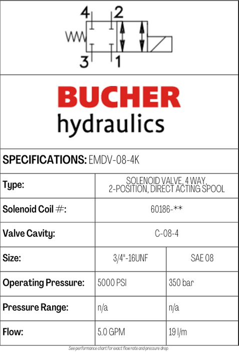 EMDV-08-N-4K-0-00 • SOLENOID VALVE 4/2 DIRECT ACTING, SPOOL TYPE • C-8-4 • 350 BAR • 19 LPM • BUCHER
