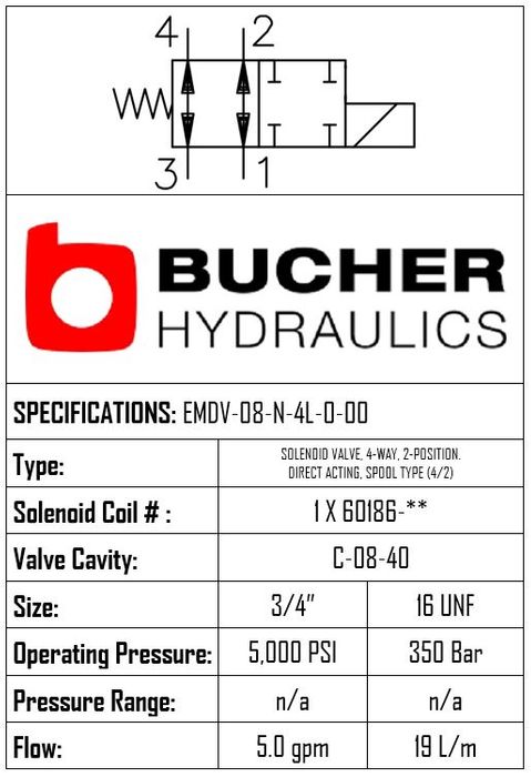 EMDV-08-N-4L-0-00 • SOLENOID VALVE 4/2 DIRECT ACTING, SPOOL TYPE • C-8-4 • 350 BAR • 19 LPM • BUCHER