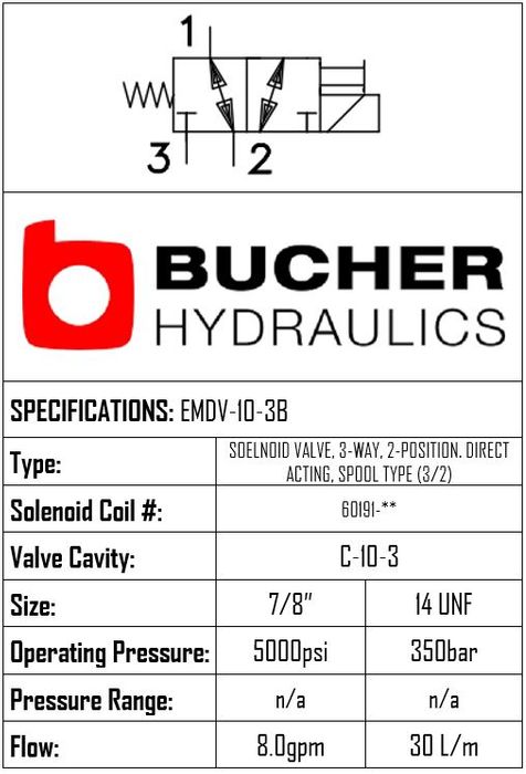 EMDV-10-N-3B-0-00 • SOLENOID VALVE 3-WAY, 2-POSITION, DIRECT ACTING, SPOOL TYPE • C-10-3 • 350 BAR • 30 LPM • BUCHER