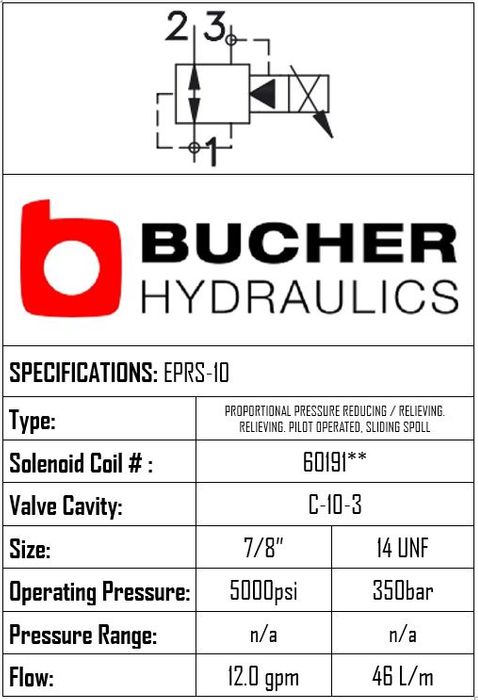 THIS PILOT OPERATED SLIDING SPOOL PROPORTIONAL VALVE USES A C-10-3 CAVITY, 3.5–207 BAR RANGE, 350 BAR MAX, AND 46 LPM FLOW. BRAND: BUCHER.