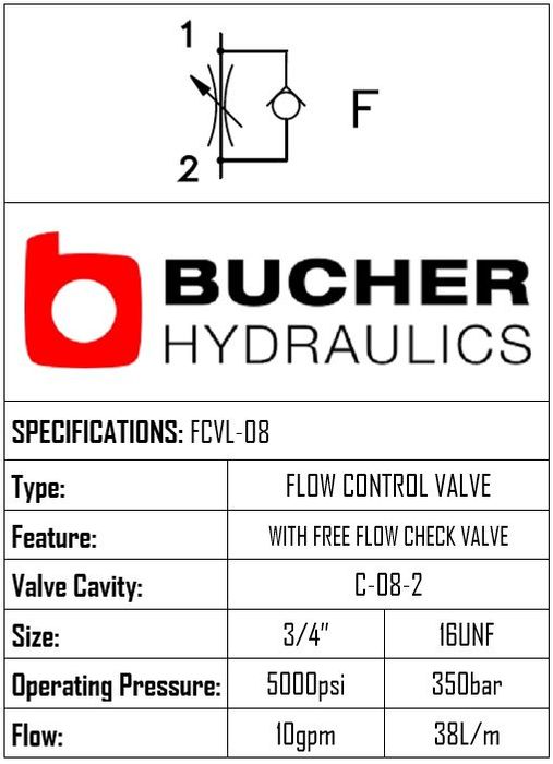 THIS ADJUSTABLE FLOW CONTROL WITH FREE REVERSE CHECK VALVE USES A C-8-2 CAVITY, OPERATES TO 350 BAR, AND FLOWS 38 LPM. BRAND: BUCHER HYDRAULICS.