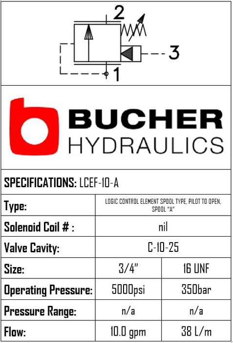 LCEF-10-N-A-F-0-100 • LOGIC CONTROL ELEMENT PILOT TO CLOSE SPOOL A • C-10-25 • 350 BAR • 76 LPM • BUCHER