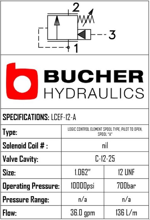 LCEF-12-N-A-F-0-100 • LOGIC CONTROL ELEMENT PILOT TO CLOSE SPOOL A • C-12-25 • 350 BAR • 136 LPM • BUCHER