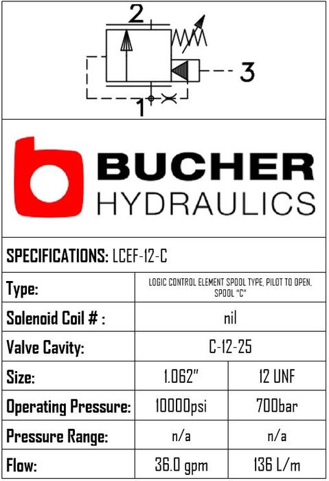 LCEF-12-N-C-F-0-100 • LOGIC CONTROL ELEMENT VENT TO OPEN SPOOL C • C-12-25 • 350 BAR • 136 LPM • BUCHER