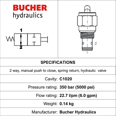 THIS 2-WAY MANUAL CONTROL VALVE IS A PUSH-TO-CLOSE SPRING RETURN HYDRAULIC VALVE USING A C-10-2 CAVITY, OPERATING UP TO 350 BAR WITH A FLOW CAPACITY OF 22.7 LPM. BRAND: WINNER HYDRAULICS.