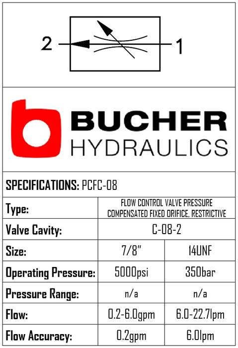 PCFC-08-N-S-O-2 • FLOW CONTROL VALVE • PRESSURE COMPENSATED • ADJUSTABLE ORIFICE • C-8-2 • 350 BAR • 6 LPM • BUCHER