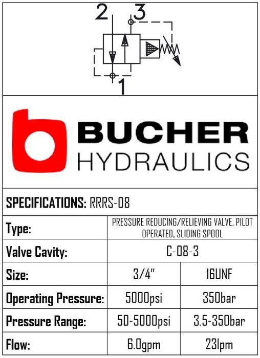 PRRS-08-N-S-0-50 • PRESSURE REDUCING/RELIEVING VALVE PILOT OPERATED SPOOL • C-8-3 • 350 BAR (3.5–315 BAR) • 23 LPM • BUCHER