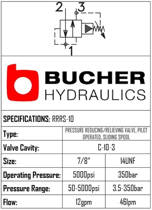 THIS PILOT OPERATED SPOOL PRESSURE REDUCING/RELIEVING VALVE FEATURES A C-10-3 CAVITY, OPERATES UP TO 350 BAR (3.5–315 BAR), AND FLOWS 46 LPM. BRAND: BUCHER.