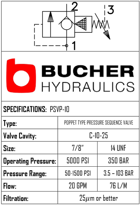 PSVP-10-N-S-0-15 • PRESSURE SEQUENCE VALVE POPPET FREE REVERSE FLOW • C-10-25 • 350 BAR (3.5–105 BAR) • 76 LPM • BUCHER