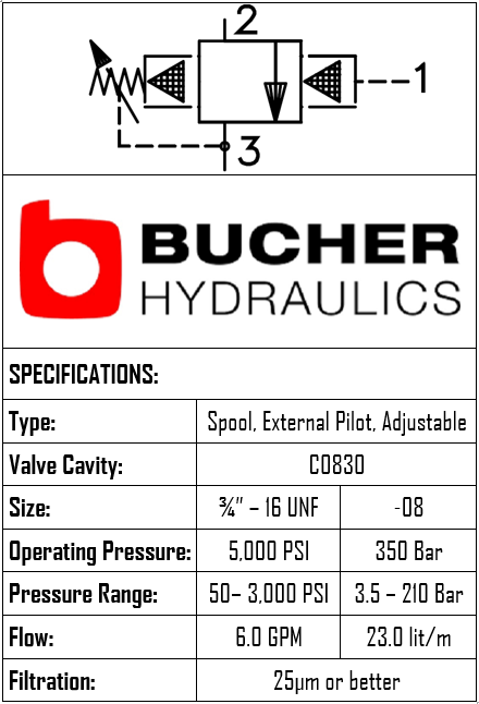 THIS PILOT OPERATED SLIDING SPOOL EXTERNAL PILOT PRESSURE SEQUENCE VALVE FEATURES A C-08-3 CAVITY, OPERATES UP TO 350 BAR (3.5–210 BAR), AND FLOWS 23 LPM. BRAND: BUCHER.