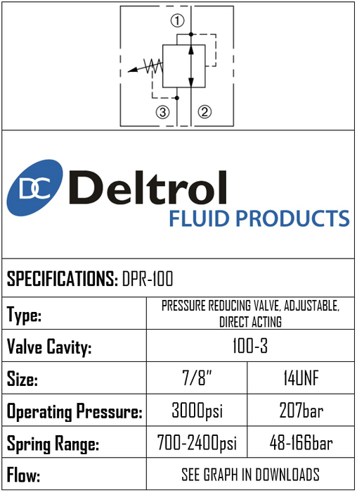 DPR100NK24 • PRESSURE REDUCING/RELIEVING VALVE DIRECT ACTING SOLENOID • 100-3 • 207 BAR (3–166 BAR) • 15 LPM • DELTROL