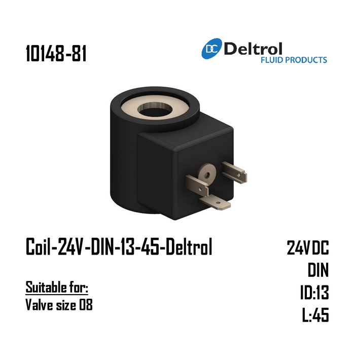 THIS COIL OPERATES AT 24 V AND USES A DIN CONNECTION WITH AN INSIDE DIAMETER OF 13 MM AND AN OVERALL LENGTH OF 45 MM. SUITS: SIZE 8. BRAND: DELTROL.