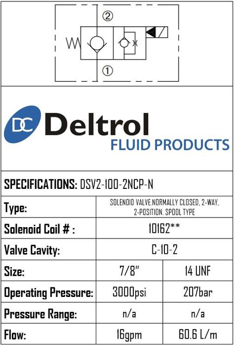 DSV2-100-2NCP-N • SOLENOID VALVE 2-WAY 2-POSITION NORMALLY CLOSED POPPET TYPE • C-10-2 • 207 BAR • 60.6 LPM • DELTROL