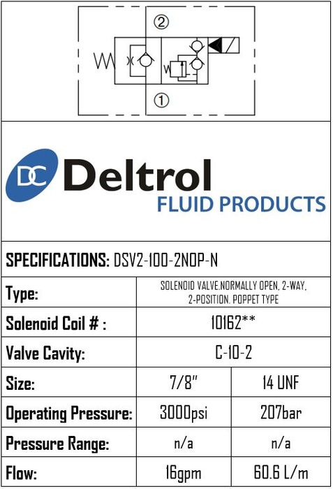 DSV2-100-2NOP-N • SOLENOID VALVE 2-WAY 2-POSITION NORMALLY OPEN POPPET TYPE • C-10-2 • 207 BAR • 60.6 LPM • DELTROL
