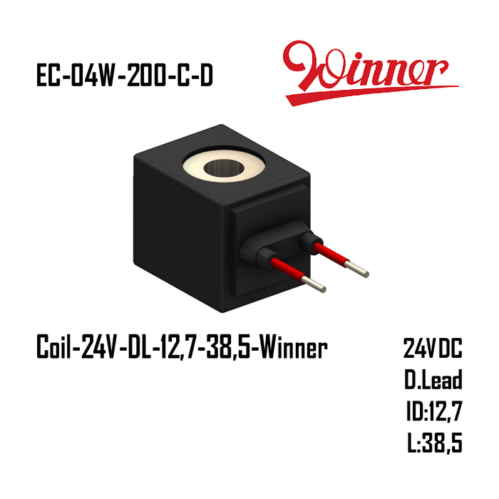THIS COIL OPERATES AT 24 VDC AND USES A LEADS CONNECTION WITH AN INSIDE DIAMETER OF 12.7 MM AND AN OVERALL LENGTH OF 38.5 MM. BRAND: WINNER.