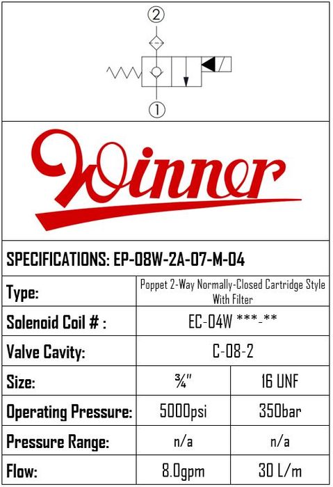 EP08W2A07M04 • SOLENOID VALVE POPPET NORMALLY CLOSED PILOT OPERATED MANUAL OVERRIDE • C-8-2 • 350 BAR • 30 LPM • WINNER