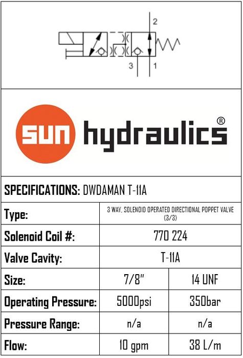THIS THREE-WAY, DIRECT ACTING DIRECTIONAL POPPET TYPE SOLENOID VALVE FEATURES A T-11A CAVITY, OPERATES UP TO 345 BAR, AND PROVIDES A FLOW CAPACITY OF 28 LPM. THE VALVE IS NORMALLY OPEN BETWEEN PORT 1 AND PORT 2 WITH PORT 3 BLOCKED. ENERGIZING THE VALVE CONNECTS PORT 2 TO 3 AND BLOCKS PORT 1. ALL FLOW PATHS ARE BIDIRECTIONAL, AND BLOCKED PATHS ARE BLOCKED IN BOTH DIRECTIONS. DUE TO THE POPPET STYLE CONSTRUCTION, THIS VALVE HAS EXTREMELY LOW LEAKAGE. BRAND: SUN.