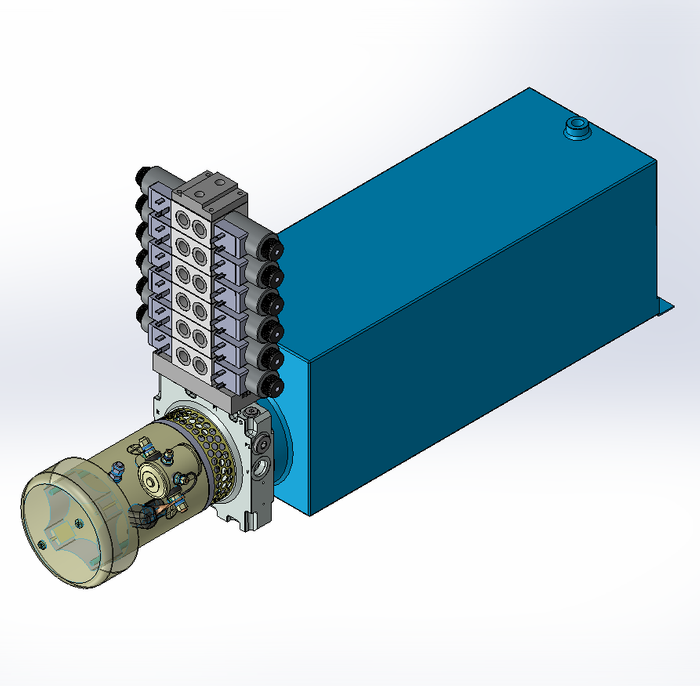 THIS HYDRAULIC POWER UNIT OPERATES WITH A 2000 W FAN ASSISTED MOTOR AT 24 V DC. DESIGNED FOR 250 BAR AND 4.0 L/MIN. INCLUDES 20 L HORIZONTAL TANK AND PMC 30 VALVE INTERFACE. 6 VALVES. BRAND: PRIMEHYD.