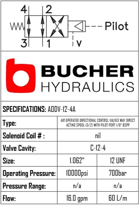 AODV-12-N-4A • PILOT DIRECTIONAL CONTROL VALVE AIR OPERATED 4-WAY (4/3) SPOOL A TYPE • C-12-4 • 350 BAR • 76 LPM • BUCHER