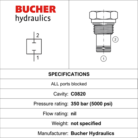 THIS CAVITY PLUG 2-WAY BLOCKS PORTS 1 & 2 USES A C-8-20 CAVITY AND OPERATES UP TO 350 BAR. BRAND: BUCHER HYDRAULICS.