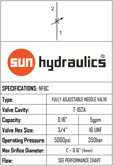 THIS FULLY ADJUSTABLE NEEDLE FLOW CONTROL VALVE USES A T-162A CAVITY, OPERATES TO 345 BAR, AND FLOWS 19 LPM (5 GPM). BRAND: SUN HYDRAULICS.