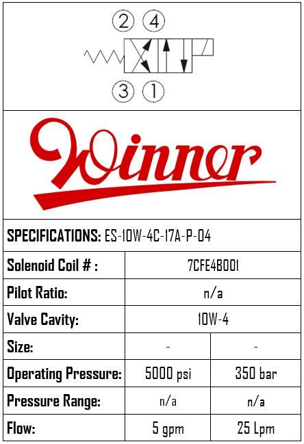 THIS DIRECT-ACTING, SPOOL TYPE, 4-WAY 2-POSITION SOLENOID VALVE FEATURES A C-10-4 CAVITY, OPERATES UP TO 350 BAR, AND HANDLES A FLOW CAPACITY OF 25 LPM.WHEN ENERGIZED, FLOW IS NOT ALLOWED IN ANY DIRECTION AND ALL PORTS ARE BLOCKED. WHEN DE-ENERGIZED, IT ALLOWS FLOW FROM PORT 2 TO PORT 1 AND FROM PORT 4 TO PORT 3. BRAND: WINNER.