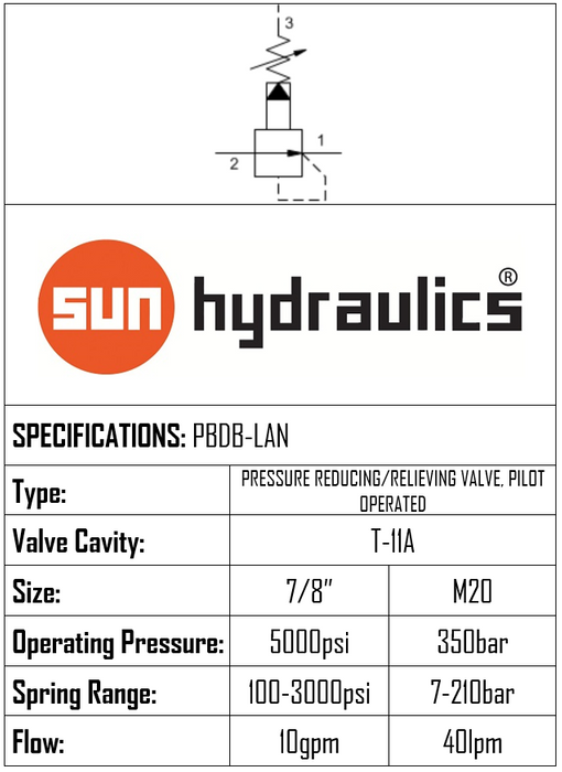 PBDB-LAN • PRESSURE REDUCING VALVE PILOT OPERATED MAIN STAGE • T-11A • 350 BAR (7–210 BAR) • 40 LPM • SUN