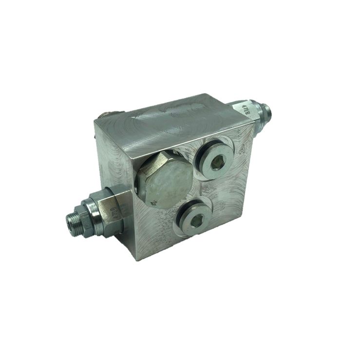 THIS BANJO-MOUNT COUNTERBALANCE VALVE IS EQUIPPED WITH 9/16" UNO X 3 PORTS, HAS A PRESSURE RATING OF 210 BAR, AND PROVIDES A FLOW CAPACITY OF 38 LPM. BRAND PRIMEHYD.