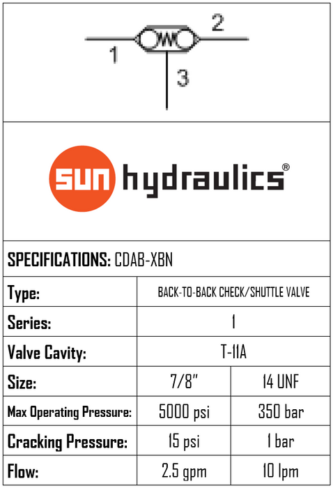 BACK-TO-BACK CHECK (SHUTTLE) WITH SIGNAL AT PORT 3, CAVITY T-11A, CARTRIDGE STYLE (NO EXTERNAL PORT), MAX OPERATING PRESSURE 345 BAR (5000 PSI), RATED FLOW 9.5 L/MIN (2.5 GPM), LOW LEAKAGE DESIGN, BRAND: SUN HYDRAULICS