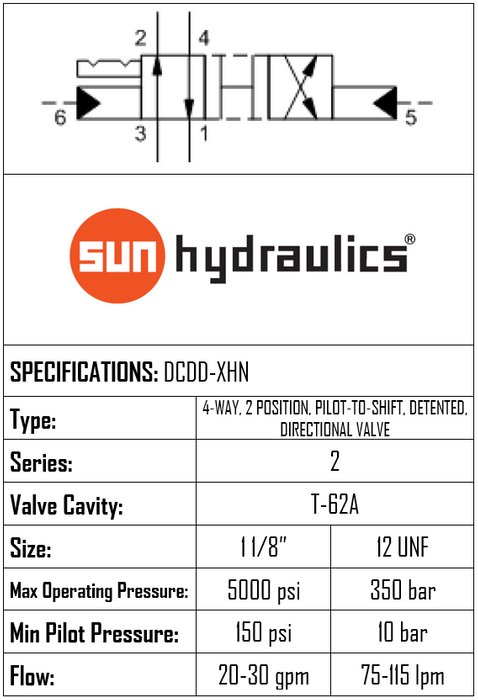 THIS 4-WAY, 2-POSITION, PILOT-TO-SHIFT, DETENTED, DIRECTIONAL SOLENOID VALVE FEATURES A T-62A CAVITY, OPERATES UP TO 345 BAR, AND HANDLES FLOWS BETWEEN 75 AND 113 LPM. IT HAS AN H SPOOL TYPE WHICH ALLOWS FLOW OVER ALL PORTS IN NUTURAL POSITION, WHEN THE PILOT PRESSURE AT PORT 5 RISES, THE VALVE SHIFTS TO ALLOW FLOW FROM 2 TO 1 AND FROM 3 TO 4. WHEN THE PILOT PRESSURE AT PORT 6 RISES, THE VALVE SHIFTS TO ALLOW FLOW FROM 3 TO 2 AND FROM 4 TO 1. BRAND: SUN.