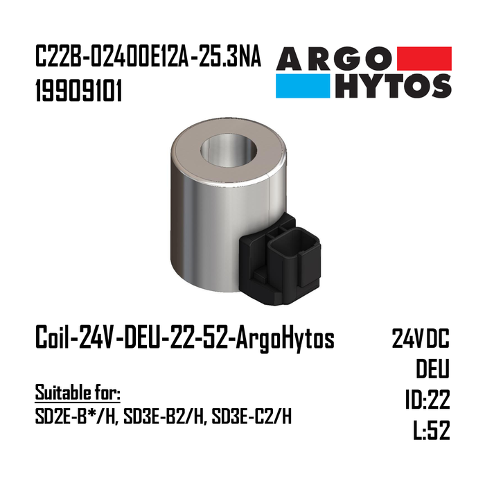 THIS COIL OPERATES AT 24 V AND USES A DEU CONNECTION WITH AN INSIDE DIAMETER OF 22 MM AND AN OVERALL LENGTH OF 52 MM. BRAND: ARGO.