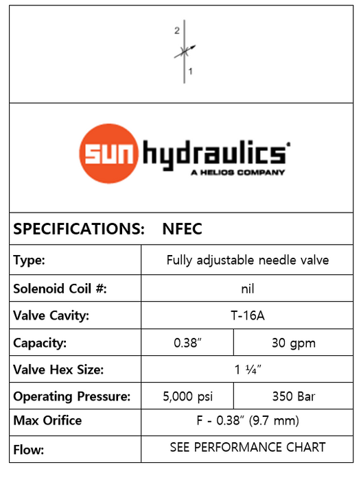 THIS FULLY ADJUSTABLE HIGH CAPACITY FLOW CONTROL NEEDLE VALVE USES A T-16A CAVITY, OPERATES TO 350 BAR, AND FLOWS 114 LPM. BRAND: SUN HYDRAULICS.