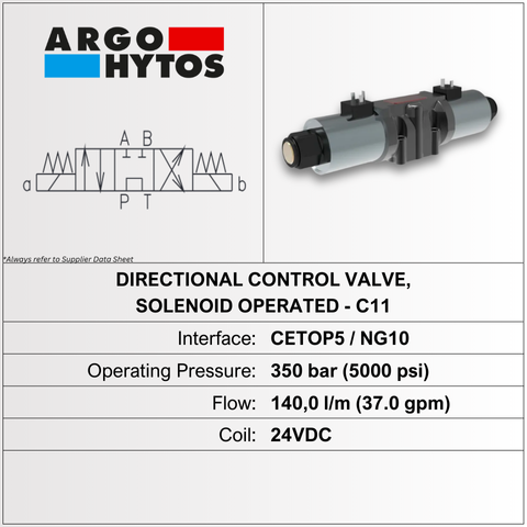 THIS SOLENOID OPERATED DIRECTIONAL CONTROL VALVE FEATURES A SPOOL C DESIGN, CETOP 05 / NG10 SIZE, A MAXIMUM OPERATING PRESSURE OF 350 BAR, AND A FLOW CAPACITY OF 140 L/MIN. BRAND: ARGO-HYTOS.