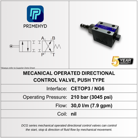 DCG SERIES MECHANICAL OPERATED DIRECTIONAL CONTROL VALVE, PUSH TYPE, CETOP3 / NG6 INTERFACE, MAX PRESSURE 210 BAR (3045 PSI), FLOW 30 L/MIN, FOR MANUAL CONTROL OF FLOW DIRECTION, BRAND: PRIMEHYD