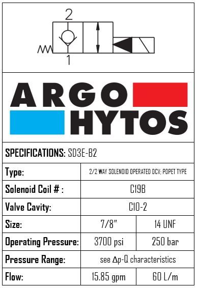 THIS SOLENOID DIRECTIONAL SPOOL VALVE 2-WAY 2-POSITION POPPET TYPE FEATURES A C-10-2 CAVITY, OPERATES UP TO 420 BAR, AND HAS A FLOW CAPACITY OF 75 LPM. WHEN SOLENOID COIL IS DE-ENERGIZED, THIS VALVE ALLOWS FLOW FROM PORT 1 TO 2 AND REVERSE FLOW FROM 2 TO 1 IS BLOCKED. WHEN SOLENOID COIL IS ENERGIZED, ALOWS FLOW BETWEEN PORTS 2 AND 1 . BRAND: ARGO.