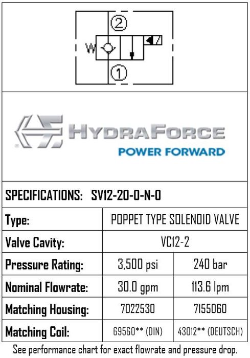 SOLENOID CARTRIDGE VALVE, 2-WAY POPPET, SPOOL TYPE 20, CAVITY SAE-12-2, MAX OPERATING PRESSURE 350 BAR (5076 PSI), RATED FLOW 114 L/MIN (30.0 GPM), PROOF PRESSURE > 420 BAR (6090 PSI) TYPICAL, INTERNAL LEAKAGE LOW, COMPATIBLE WITH MINERAL OILS (ISO VG 32–46), SEALS BUNA OR VITON (PER MODEL), AMBIENT/TANK TEMP -30°C TO +120°C (TYPICAL), COIL EC-04W, 12 VDC / 24 VDC / 110 VAC / 230 VAC, 20 W, BRAND: STEED MACHINERY