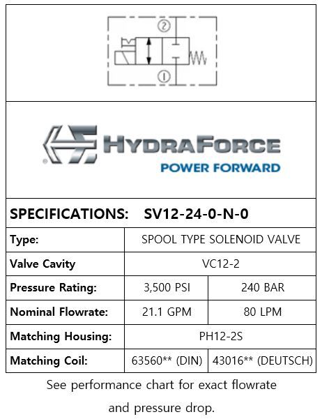 SOLENOID CARTRIDGE VALVE, 2-WAY POPPET, SPOOL TYPE 24, CAVITY SAE-12-2, MAX OPERATING PRESSURE 350 BAR (5076 PSI), RATED FLOW 114 L/MIN (30.0 GPM), PROOF PRESSURE > 420 BAR (6090 PSI) TYPICAL, INTERNAL LEAKAGE LOW, COMPATIBLE WITH MINERAL OILS (ISO VG 32–46), SEALS BUNA OR VITON (PER MODEL), AMBIENT/TANK TEMP -30°C TO +120°C (TYPICAL), COIL EC-04W, 12 VDC / 24 VDC / 110 VAC / 230 VAC, 20 W, BRAND: STEED MACHINERY
