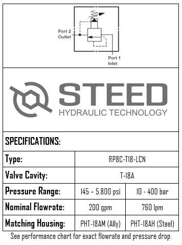 RP8C-T18A-LCN • RELIEF VALVE • DIRECT ACTING • POPPET TYPE • T-18A • 350 BAR (SET 10–400 BAR) • 760 L/MIN • STEED HYDRAULICS