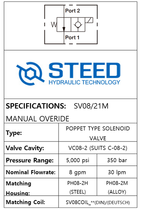THIS SOLENOID VALVE POPPET, 2 WAY 2 POSITION, NORMALLY OPENTYPE (MANUAL OVERRIDE) FEATURES A SAE-08-2 CAVITY, OPERATES UP TO 350 BAR, AND HAS A FLOW CAPACITY OF 30 LPM. WHEN DE-ENERGIZED, IT ALLOWS FLOW FROM 2 TO 1. FLOW FROM 1 TO 2 IS SEVERELY RESTRICTED. WHEN ENERGIZED, THE VALVES POPPET CLOSES ON ITS SEAT, BLOCKING FLOW FROM 2 TO 1. THE CARTRIDGE WILL ALLOW 1 TO 2 FLOW AFTER OVERCOMING THE SOLENOID FORCE. BRAND: STEED.